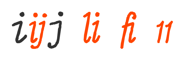 Rukopis, maaaasu znakova, latinica, glagoljica i ćirilica. Ima foru da se mjenjaju slova pa izgleda malo više kao ruokm pisano. Hrpa OpenType fičrsa. O.K. je u tekstu, O.K. je za neke naslove. Small caps čak i za brojke.
